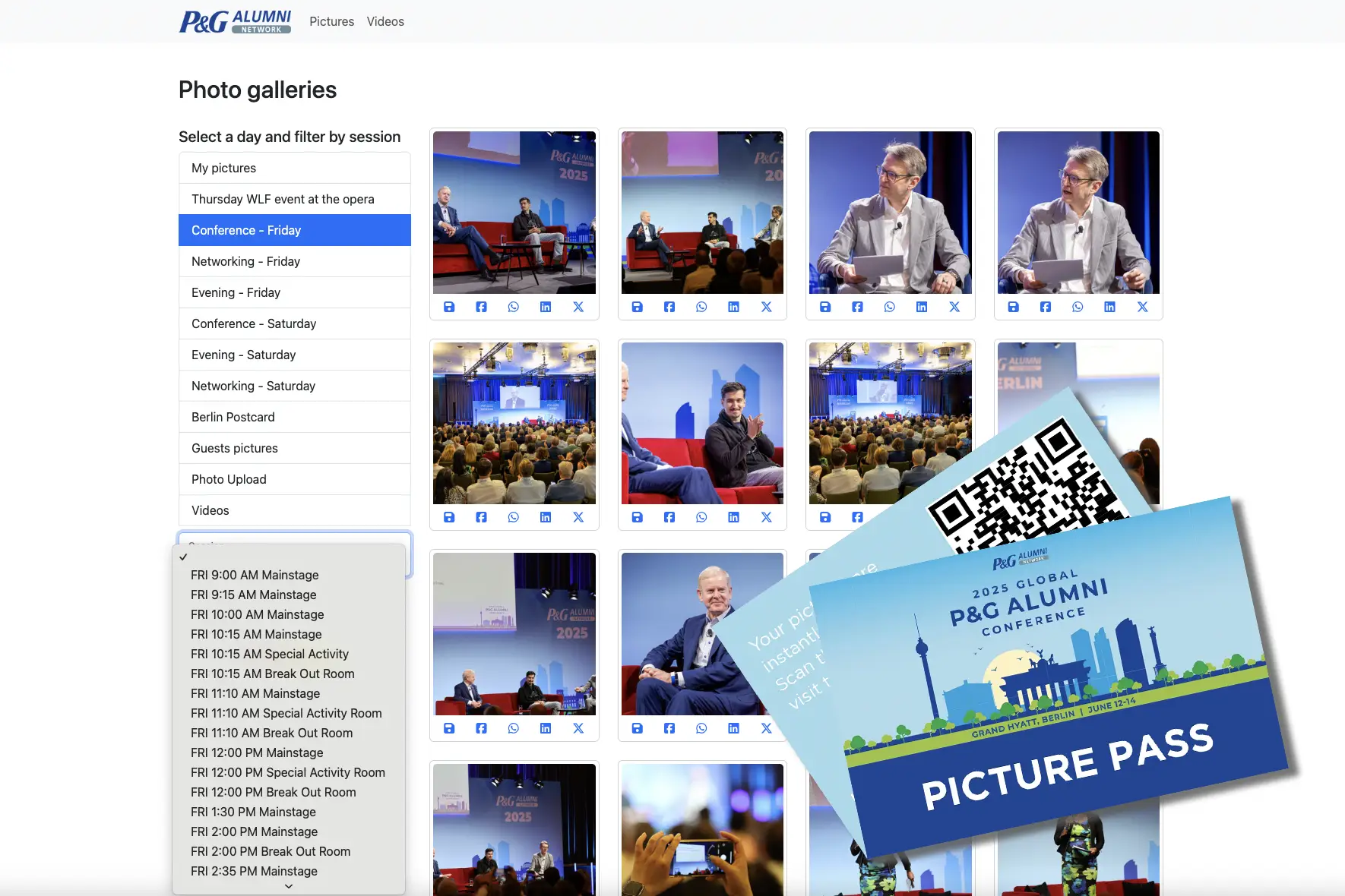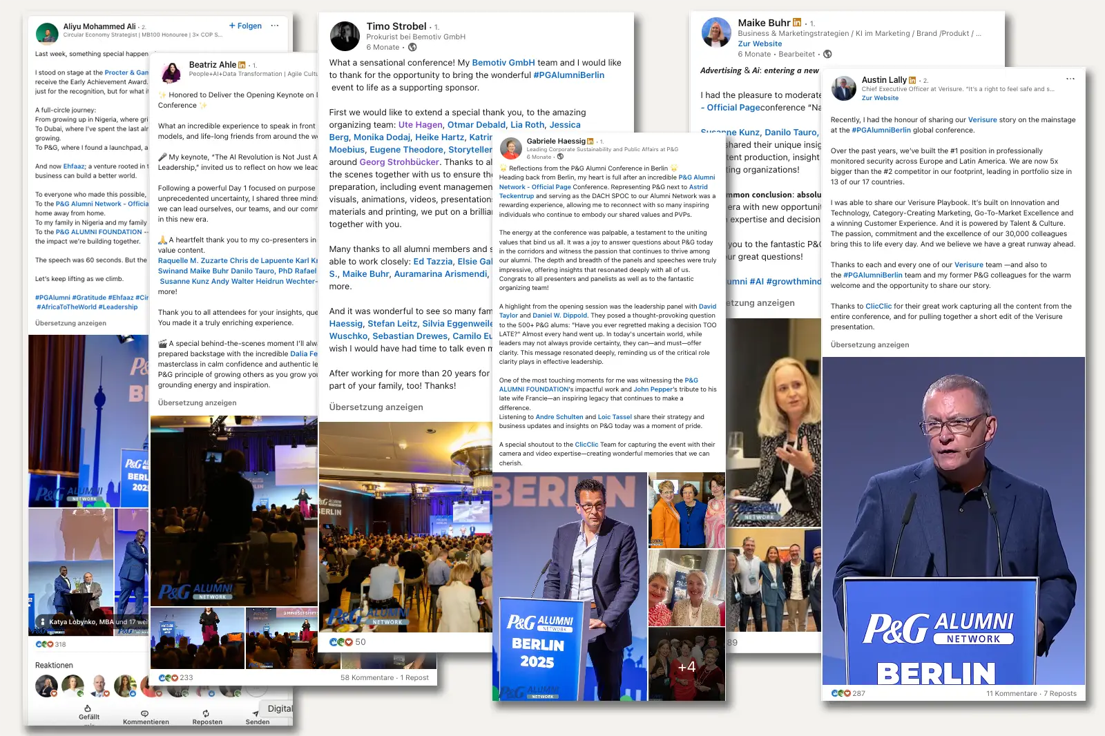Im Grand Hyatt Berlin traf sich das P&G Alumni Network aus der ganzen Welt – und wir waren mittendrin, um die Highlights live einzufangen. Mit unserer gebündelten ClicClic-Technik konnten die Teilnehmer:innen schon während des Events in der gebrandeten Live-Galerie durch Fotos stöbern, nach Panels und Keynotes filtern und ihre besten Momente sofort teilen.